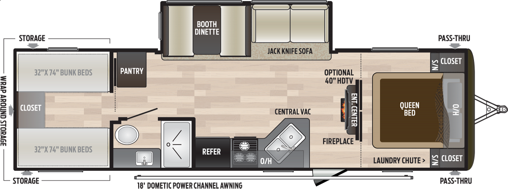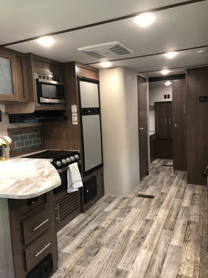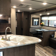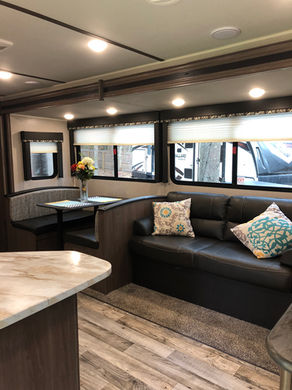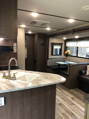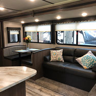 Our East Hampton (2020 Keystone Hideout) is the perfect camper for a larger family to enjoy. The bunkroom contains 4 bunks and large wardrobe for storage. Within the single slide is a booth dinette and a sofa which are both great for lounging during the evening and sleeping at night, and your kids or guests will enjoy the 2 sets of bunk beds in the bunk room. Along either side of the entertainment center are two accordion doors which close off the front bedroom and add just the right amount of privacy. Her overall length is 33ft.